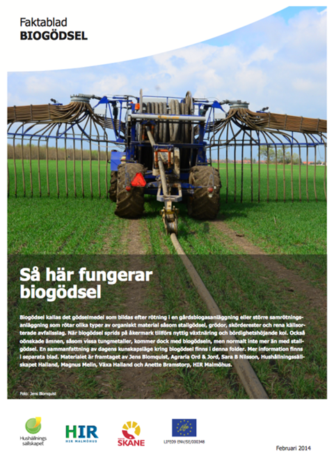 Faktabladen om biogödsel togs fram av Hushållningssällskapet 2013. Författarna till de olika artiklarna är Anette Bramstorp, HIR Malmöhus, Jens Blomquist, Agraria Ord & Jord, Sara B Nilsson, Hushållningssällskapet Halland och Magnus Melin, Växa Halland.